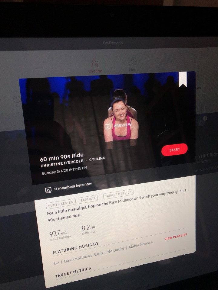 - 5 workouts. 1 45 min ride, 1 HIIT Ride, 1 full body strength, 1 low impact ride, and 1 other of my choice
