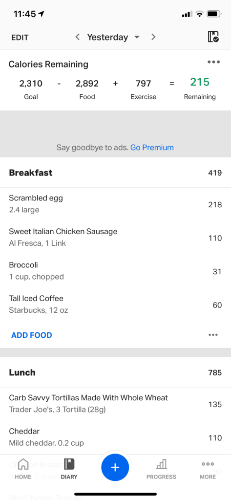 Weight Watchers has a number of options for its users. I chose to use the app and omitted in person meetings. This plan assigns points to common food items based off of their nutritional value. Depending on your size, activity level, and goals, you are assigned a point target per day.